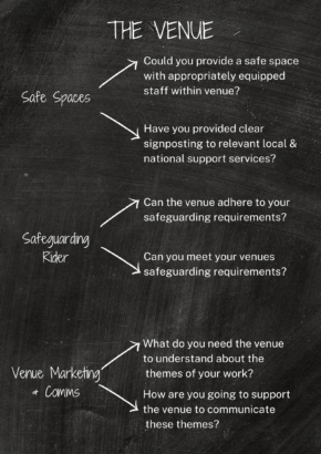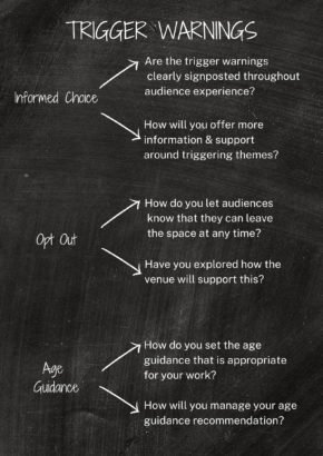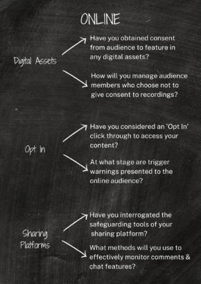 Questions for Safeguarding the Audience shares a series of prompts – to help you to consider your options for safeguarding audiences. Safeguarding Audience may change depending on the delivery platform of the work.  Some questions may not be relevant to your organisation and some considerations may be new to you. The aim is to encourage reflective discussion as you develop your safeguarding and wellbeing provision for everyone involved.